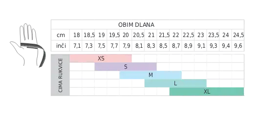 Materijal: dlan: 50% poliamid, 50% poliuretan; gornji deo: 98% poliamid, 2% elastan; traka oko zgloba: 100% poliamid